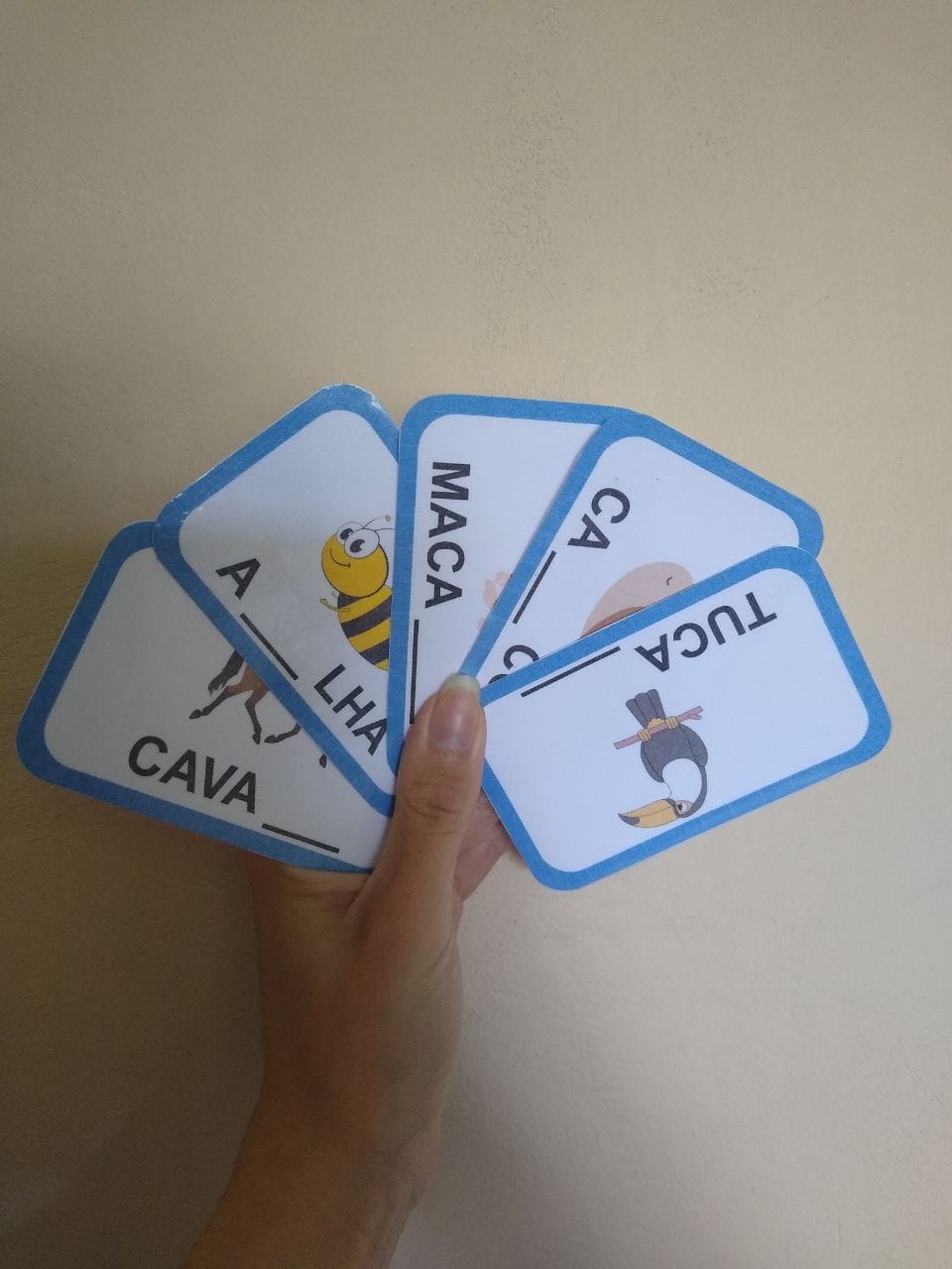 Este jogo tem o objetivo de desenvolver a leitura de palavras e instigar a análise dos nomes dos animais, com especial atenção à sílaba faltante, buscando nas fichas a que se encaixa para formar a palavra.