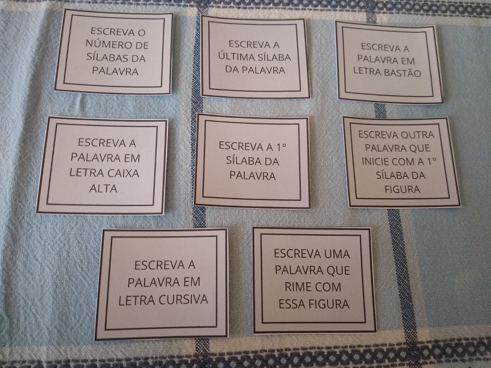 O arquivo é composto por 16 cartas com imagens (animais, brinquedos, alimentos e meios de transporte) + 16 fichas com as palavras do jogo (em letra bastão / caixa alta) + 8 fichas com desafios envolvendo as palavras – todos para recorte.