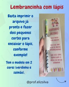 - LEMBRANCINHA LÁPIS: 4 por folha, nas cores salmão e verde. Após imprimir, você deve fazer 2 cortes para encaixar o lápis;